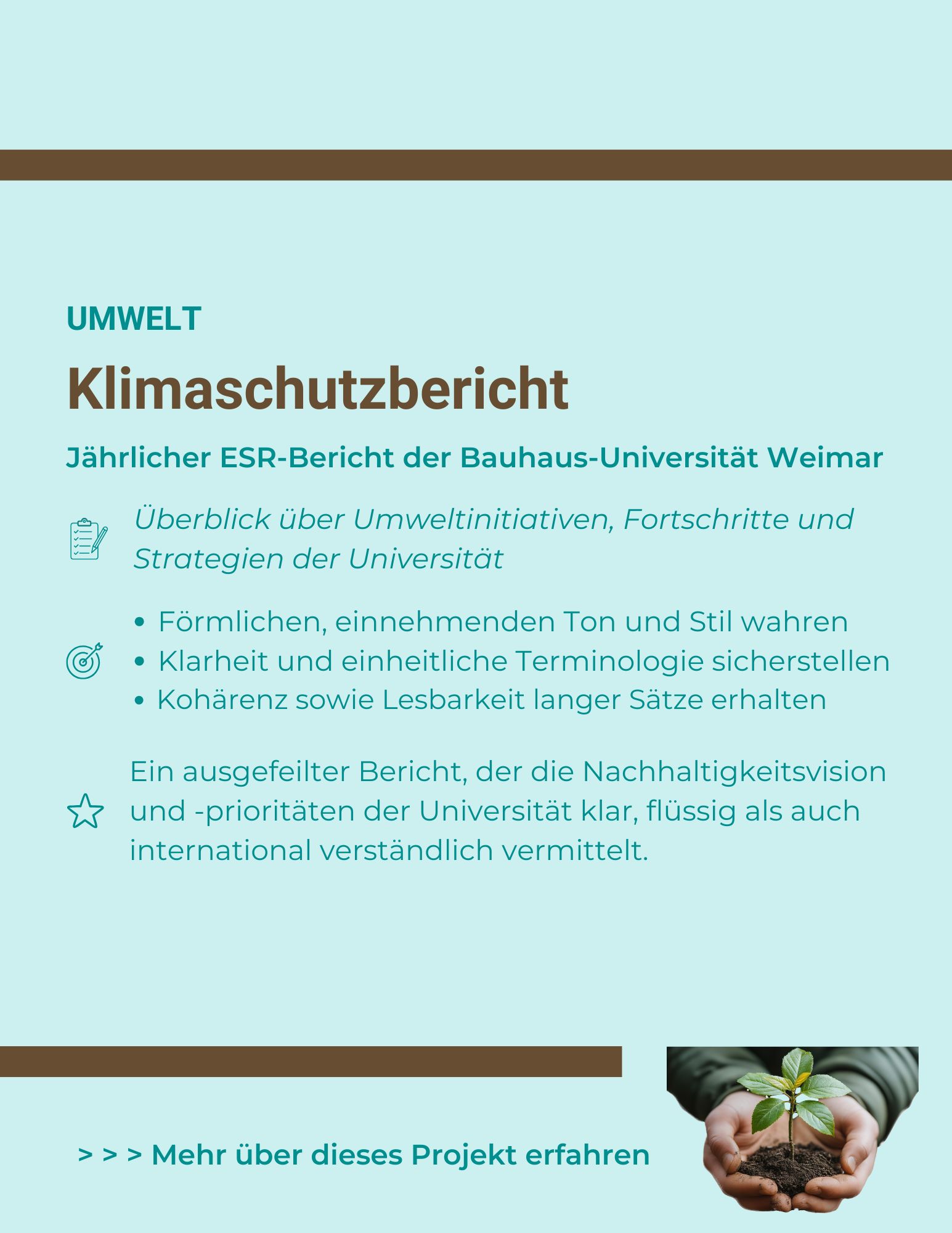Ob Umwelt, Bildung, Kultur, Tourismus oder Marketing – es gelten immer dieselben hohen Standards, für jeden Kunden und bei jedem Projekt: Der Zieltext muss klar, konsistent, logisch und vor allem für seinen beabsichtigten Zweck geeignet sein.